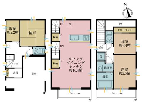 | 設備 | 都市ガス/公営水道/下水排水/インターホンTV/フローリング/システムキッチン/バルコニー/対面キッチン/クローゼット/駐車場/トイレ2ヶ所/シューズボックス/小学校まで1km以内/リビング階段/LDK15畳以上/ビルドガレージ | ||